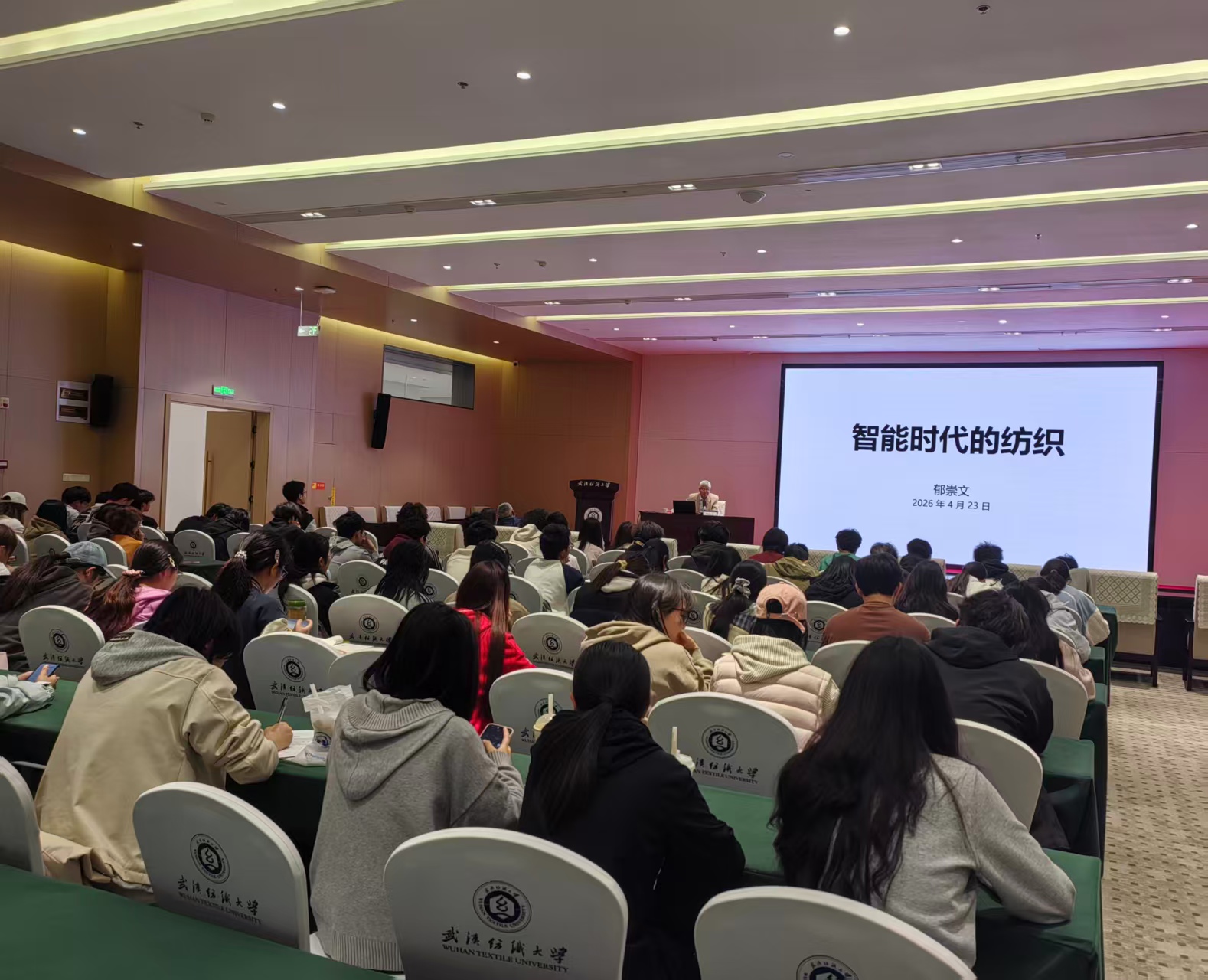 讲座中,郁崇文教授以纺织行业发展脉络为切入点,从纺织的发展与应用、纺织新技术与智能化、纺织教学的数智化发展三个维度展开分享。他结合行业案例,系统梳理了纺织学科从传统制造到跨界融合的发展历程,解读了数字化纺纱、智能织造等前沿技术对产业升级的推动作用;郁崇文教授结合主编国家级规划教材《纺纱学》的经验,现场向同学们介绍了教材配套的线上学习资源,为拔尖班学生的专业学习与创新实践提供了清晰指引。现场学子认真聆听、积极思考,对智能纺织领域的创新机遇展现出浓厚兴趣。