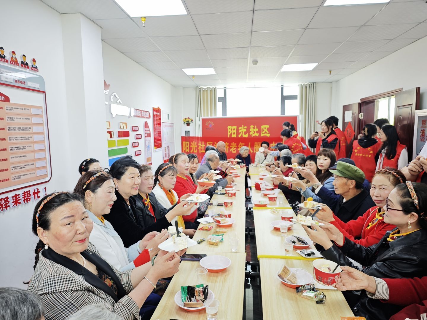 上午10点,生日会仪式正式拉开帷幕。志愿者合力将缀满新鲜水果的生日蛋糕缓缓推至会场中央。悠扬的生日歌响起,全体志愿者与寿星、社区工作人员一同打节拍合唱。歌声落毕,志愿者将切分好的蛋糕一一送至每位老人手中,老人们品尝着香甜蛋糕,脸上漾开幸福笑意,现场暖意融融。